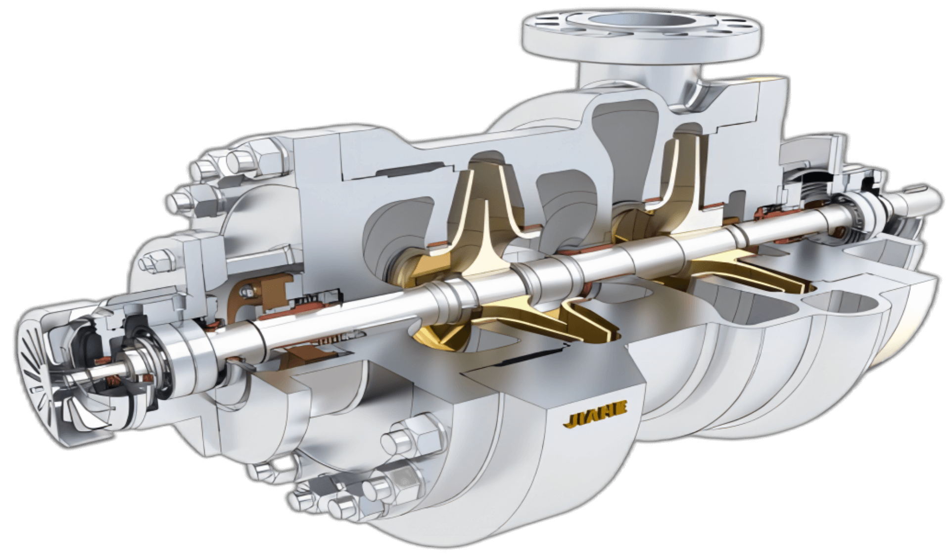 JHBB/JHBD泵(BB2)為兩級、徑向剖分兩端支承離心泵。符合API610-11th標準。JHBB為首級單吸,JHBD為首級雙吸。進出口法蘭尺寸滿足ANSI或ISO標準。密封腔的設計符合ISO21...
